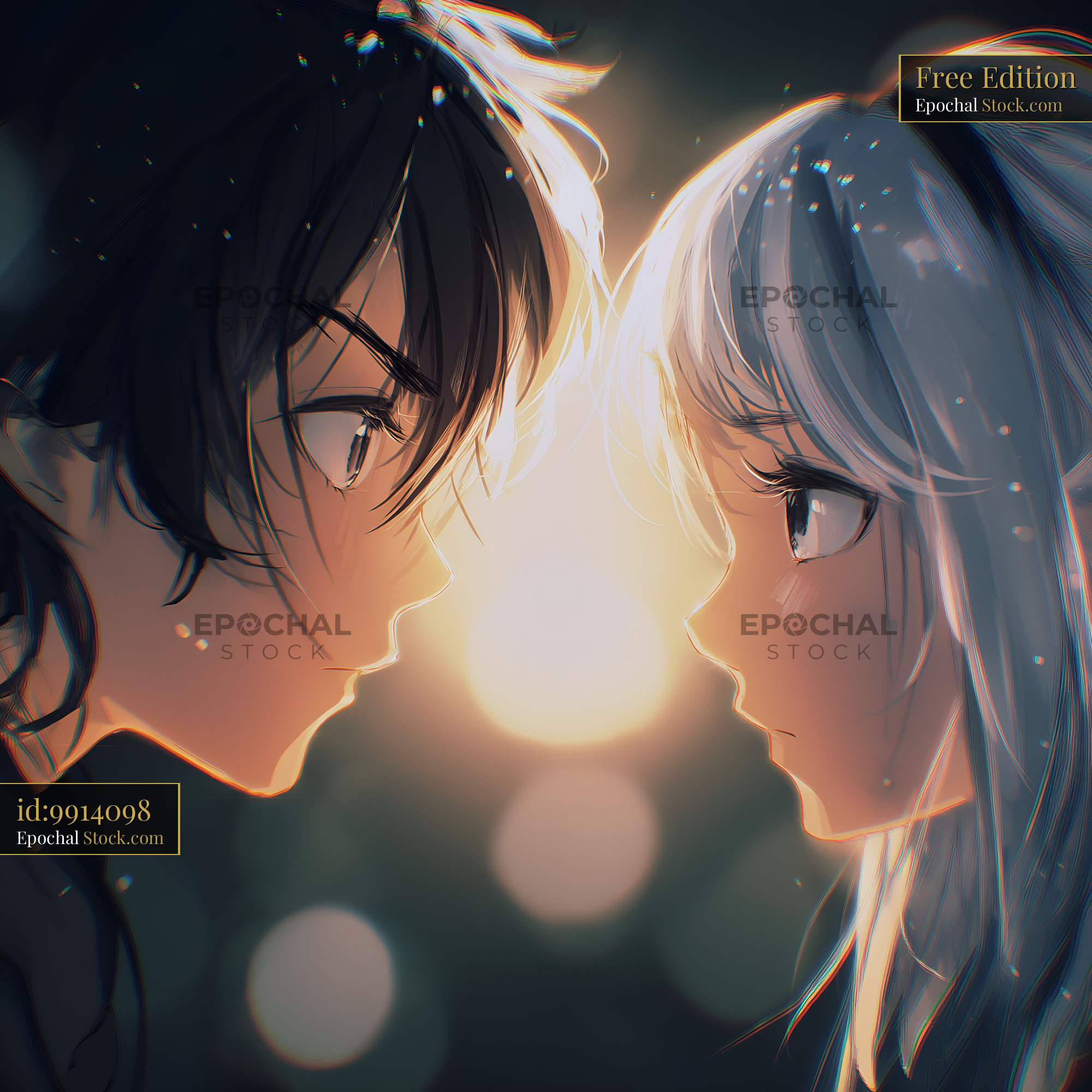 Two animated characters stand closely together with intense expressions. They look directly at each other against a soft, glowing background. The scene shows a connection between them.