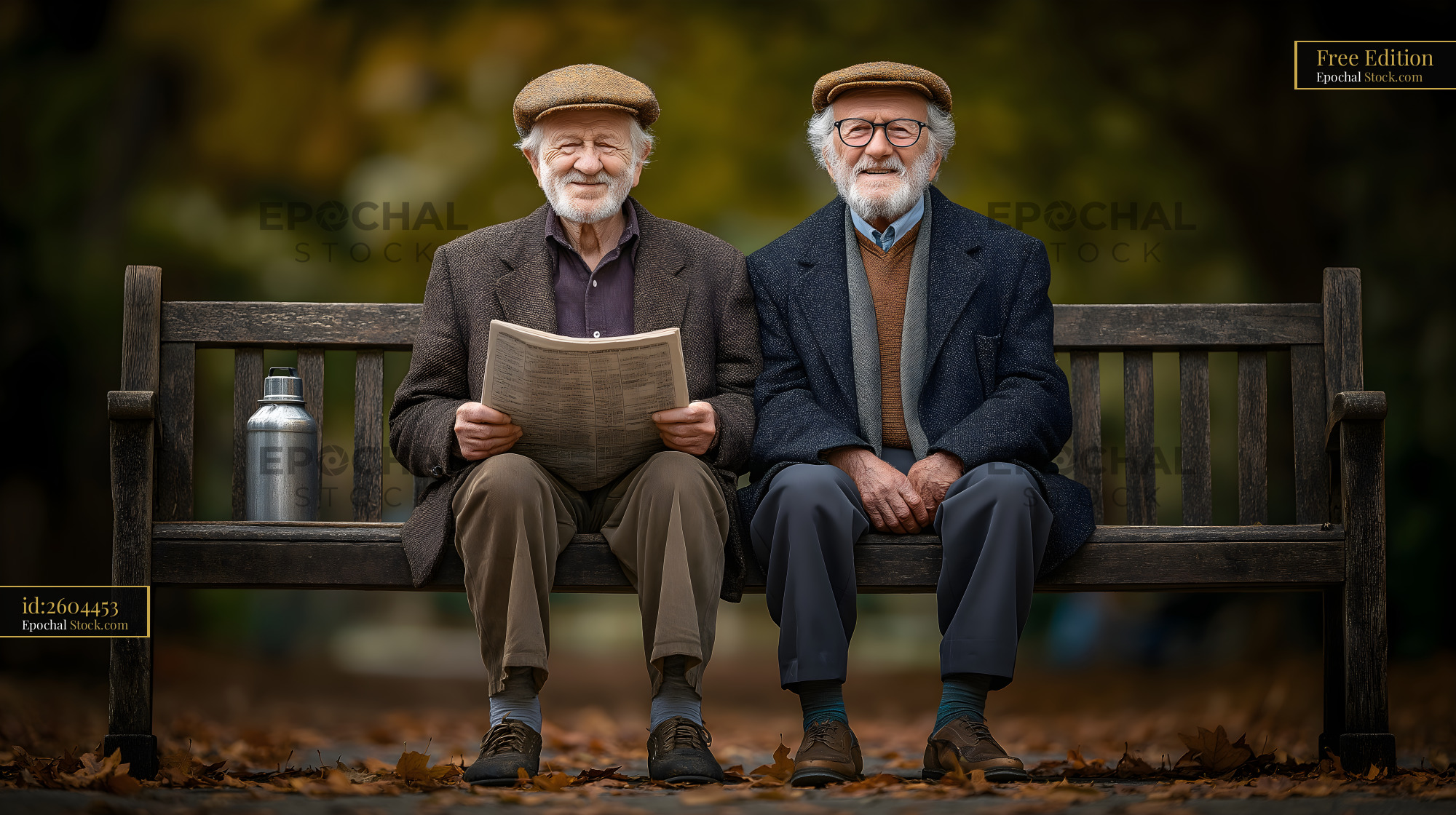 Two elderly men sit on a park bench enjoying a newspaper together. They smile and wear flat caps. Autumn leaves cover the ground and trees in the background show seasonal colors.