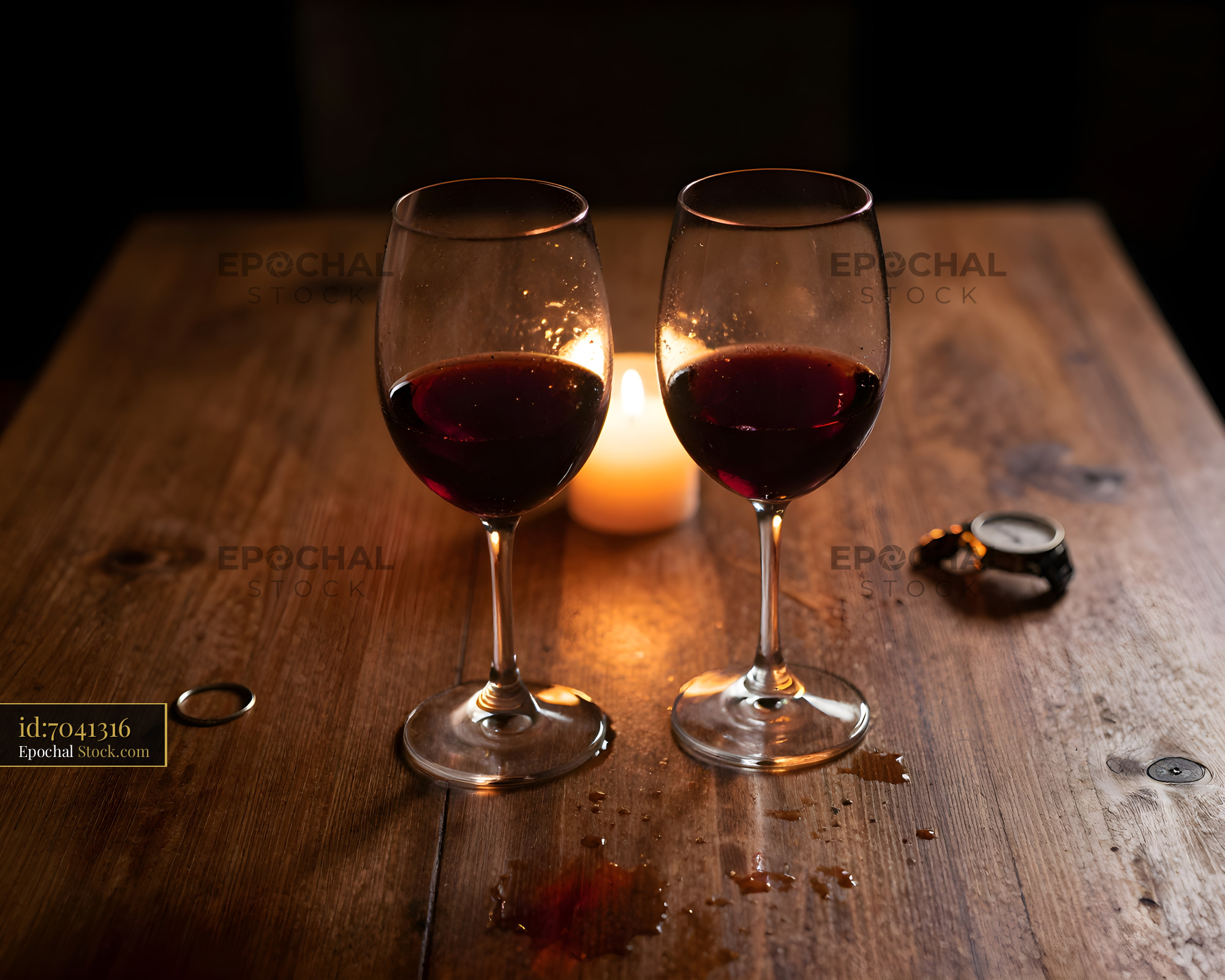 Two glasses filled with red wine sit on a wooden table. A candle flickers nearby, creating a warm glow. There are drops of wine on the surface, adding to the scene's ambiance.