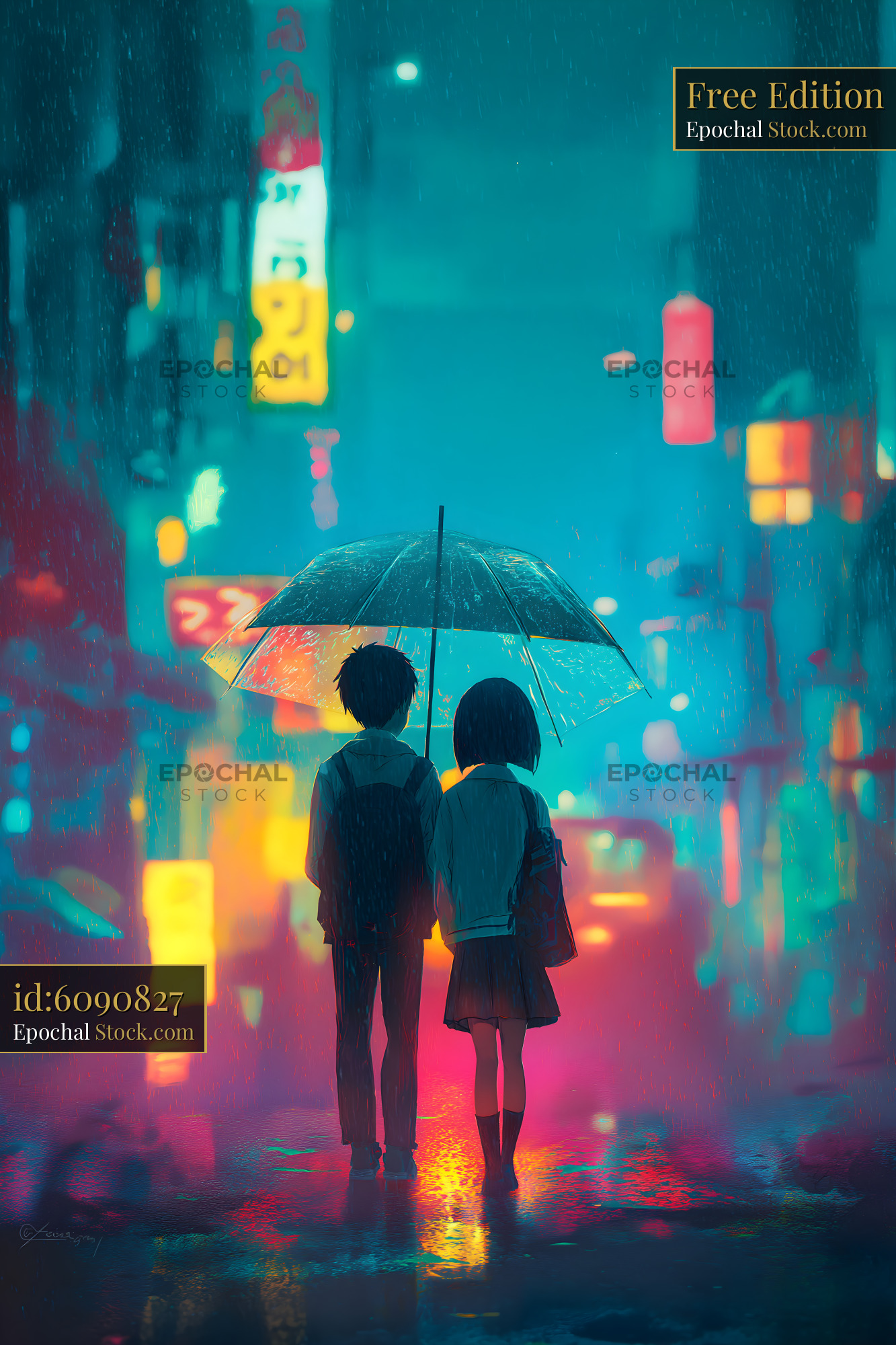 Two figures stand close together under an umbrella in a rainy city. Colorful lights shine in the background, creating a lively urban scene at night. The streets are wet and reflective.