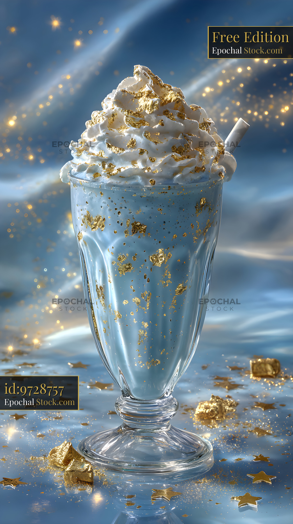 A creamy drink with whipped topping and gold accents sits in a clear glass. Stars and gold pieces are scattered around it on a blue background. The setting appears festive and fun.