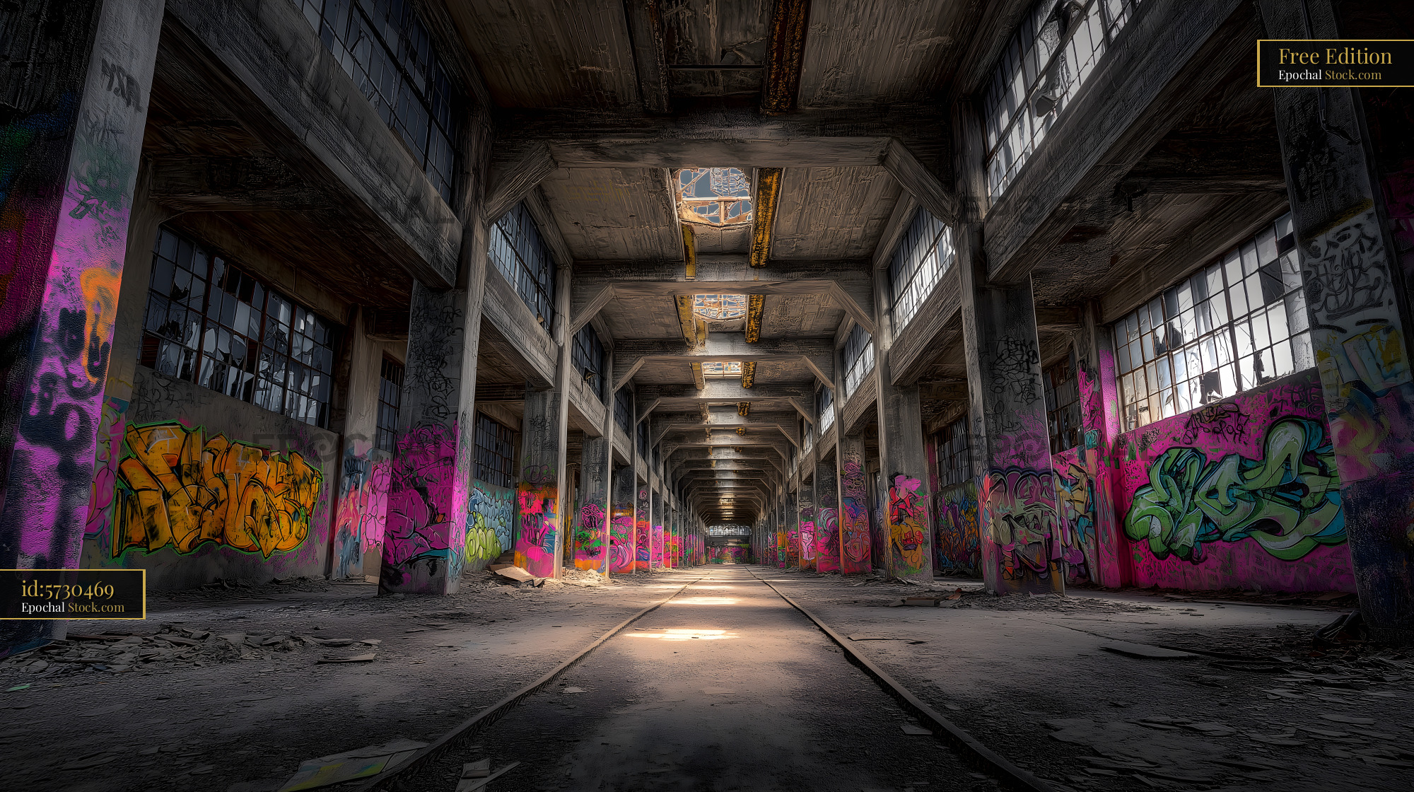 Urban exploration in a derelict warehouse with graffiti Free Premium Stock Image
