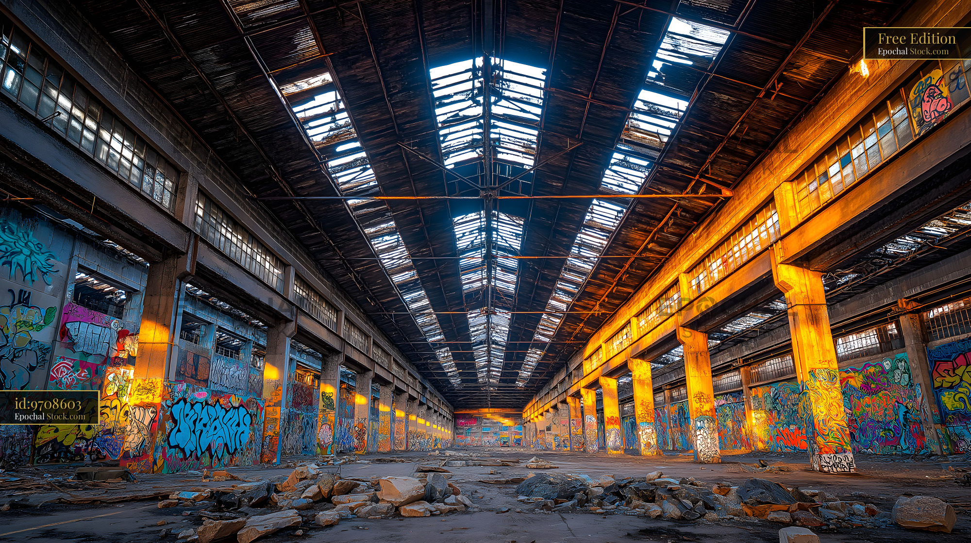 Light streams through broken windows in an old warehouse. The walls are covered in colorful graffiti. The space is empty with debris on the ground and large concrete pillars standing tall.
