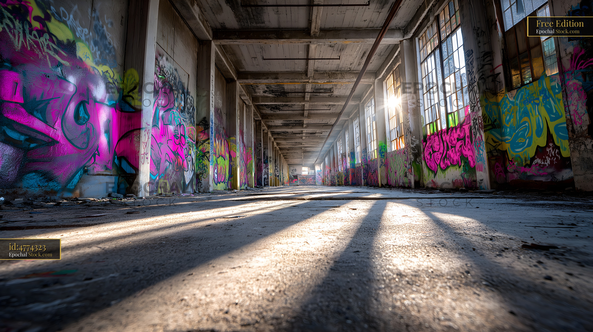 Bright colors cover the walls of a long abandoned building. Sunlight shines through windows while shadows stretch across the floor. The area shows signs of past use and creativity.