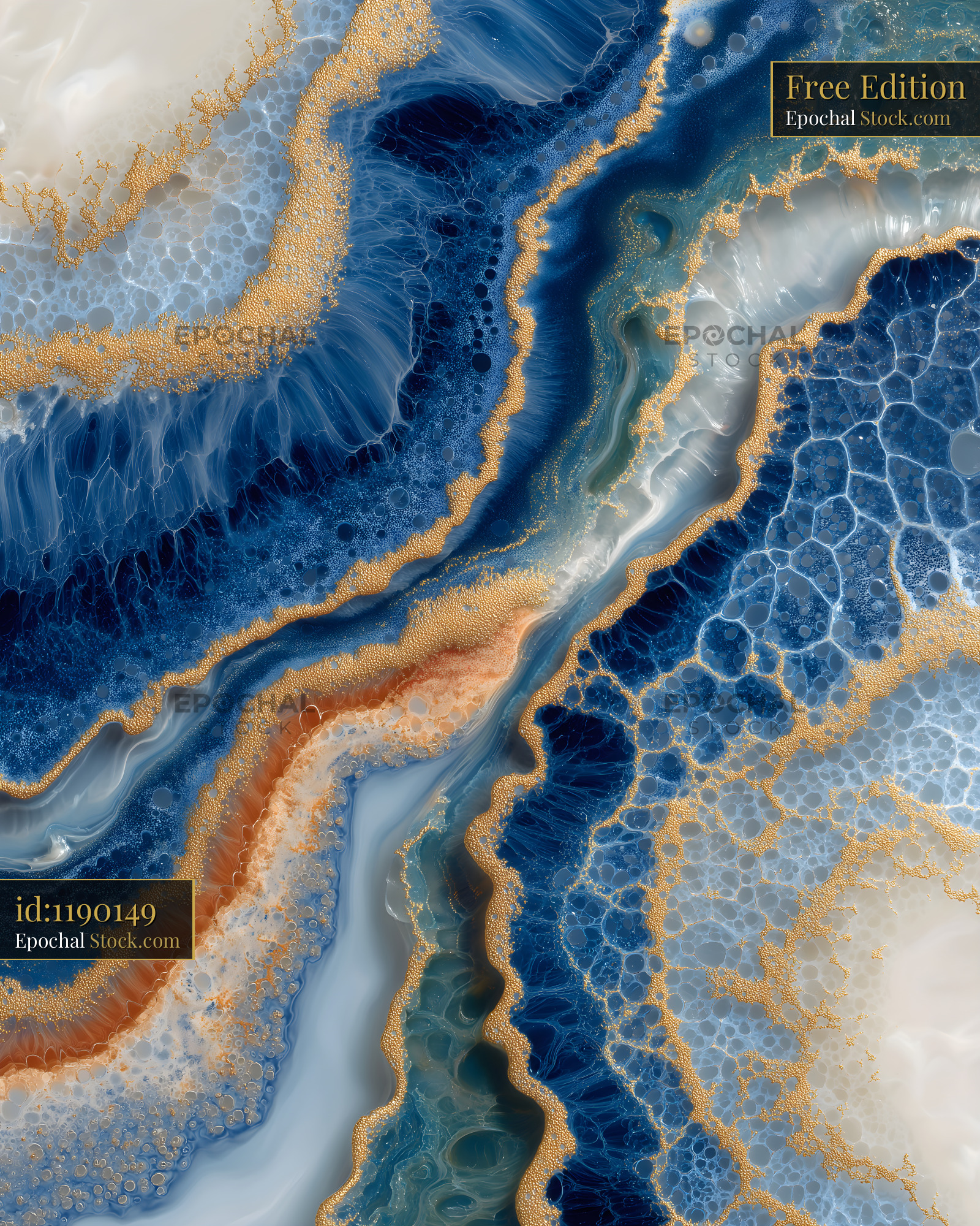 An abstract design with blue and white colors mixed with gold. The swirling patterns create a sense of movement and depth. The colors blend together in an artistic way.