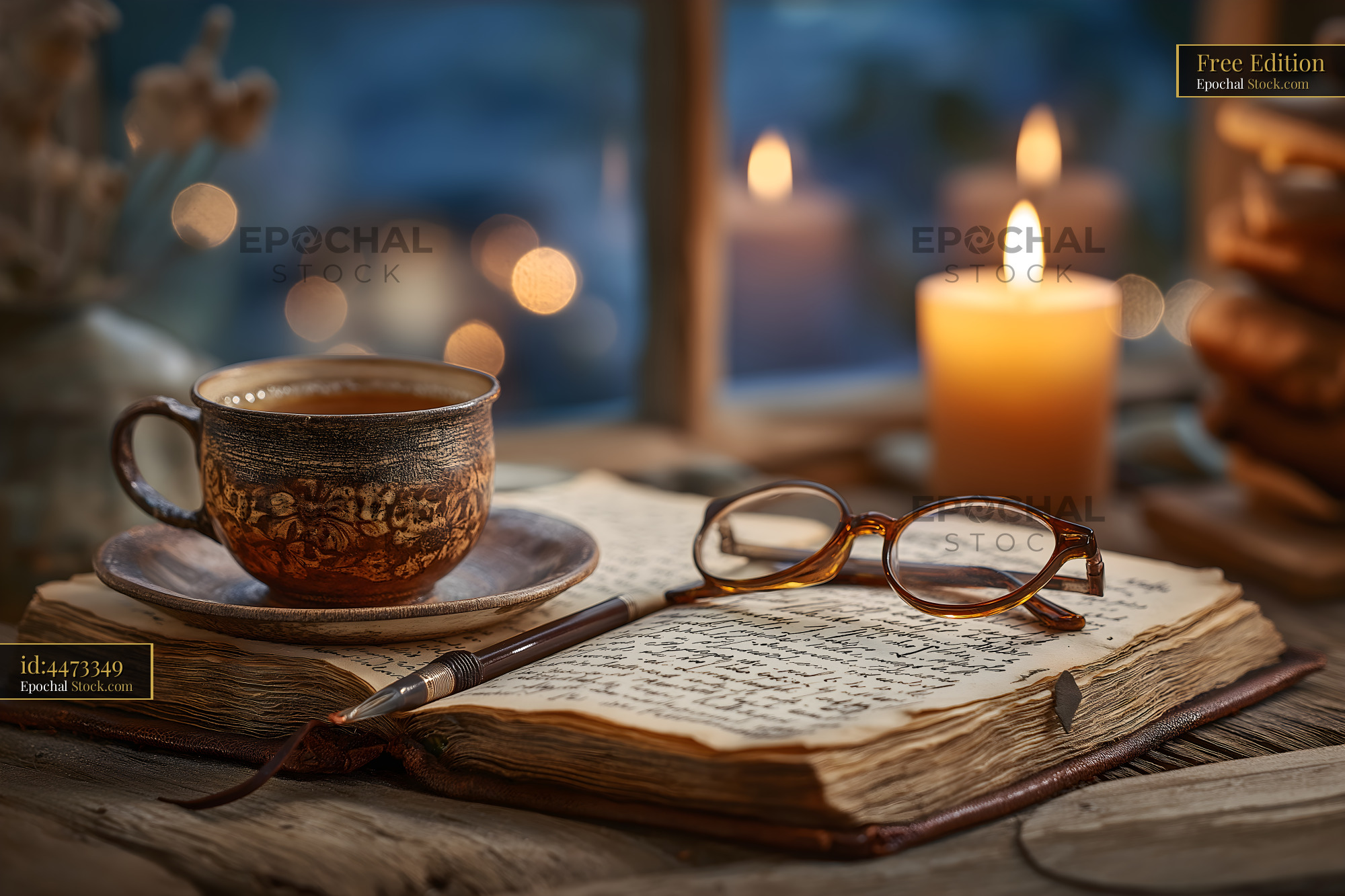 Warm drink, open book, and reading glasses by candlelight Free Premium Stock Image
