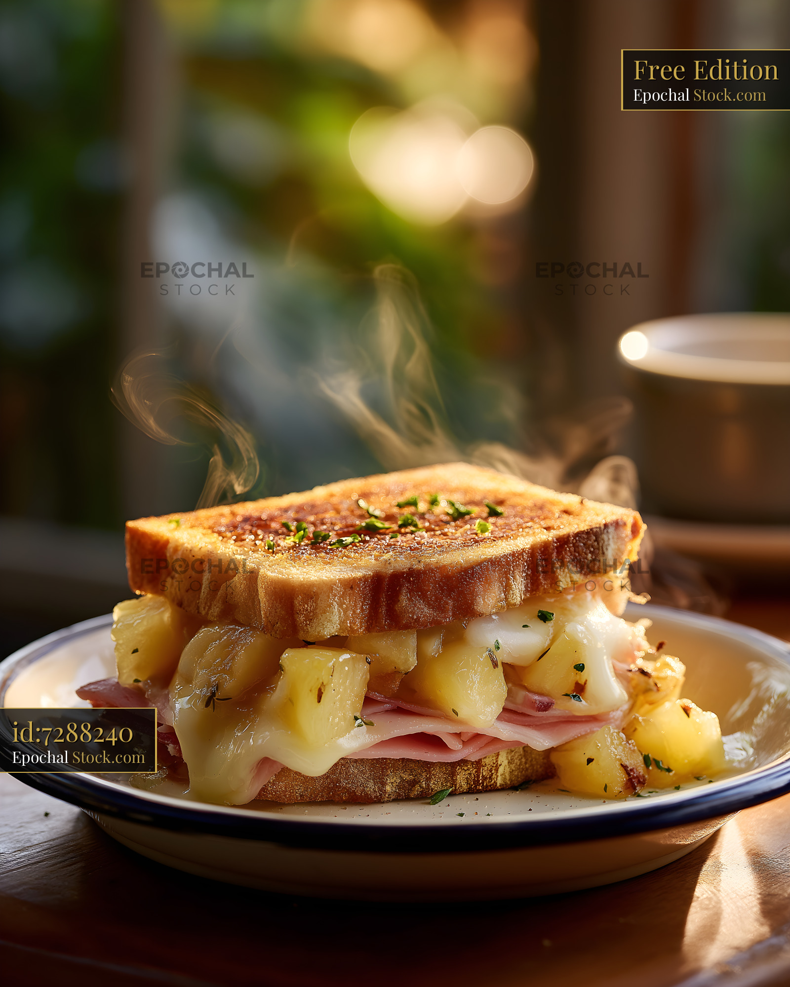 A sandwich with layers of ham, cheese, and pineapple sits on a plate. Steam rises from the sandwich. Soft light enters from a window. A drink is in the background.