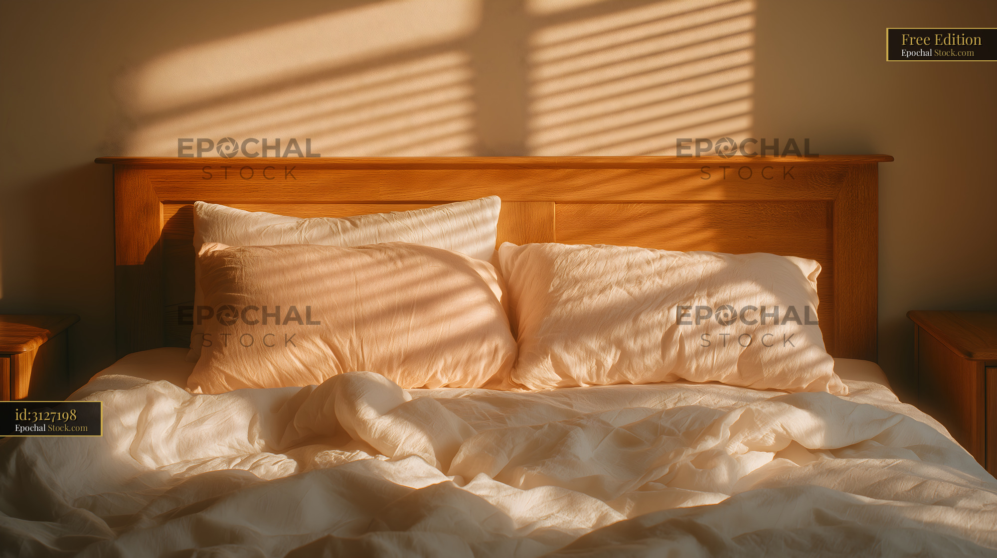 Warm sunlight fills a bed with soft pillows and blankets Free Premium Stock Image