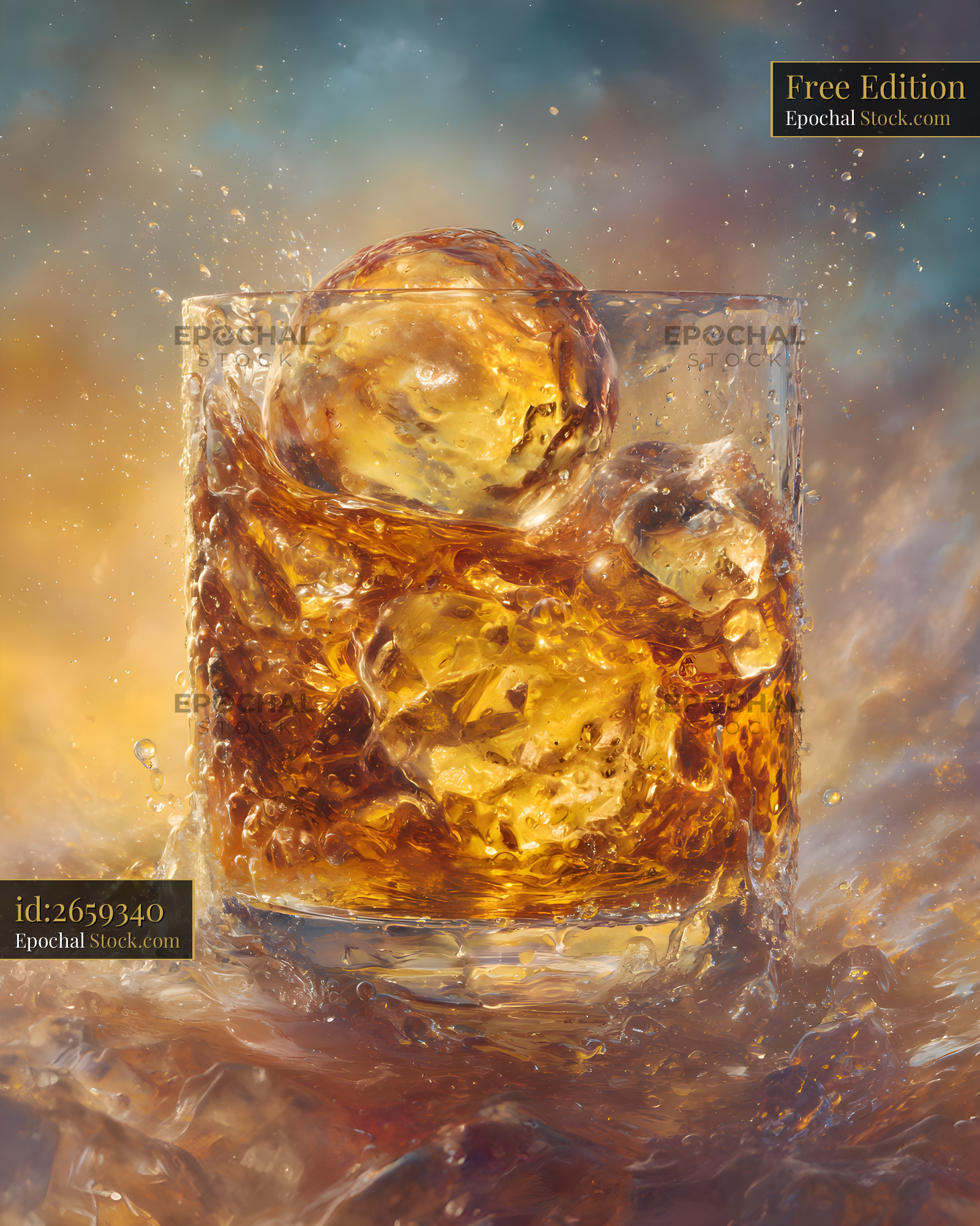 A glass filled with whiskey sits on a table. Ice cubes drop into the drink, causing splashes of liquid to rise. The background shows soft colors and light, creating a warm feel.