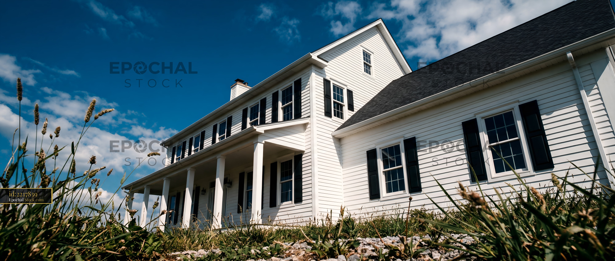 A large white house sits on a grassy field with clear blue skies and scattered clouds. The building features a porch with columns and multiple windows on its front side.