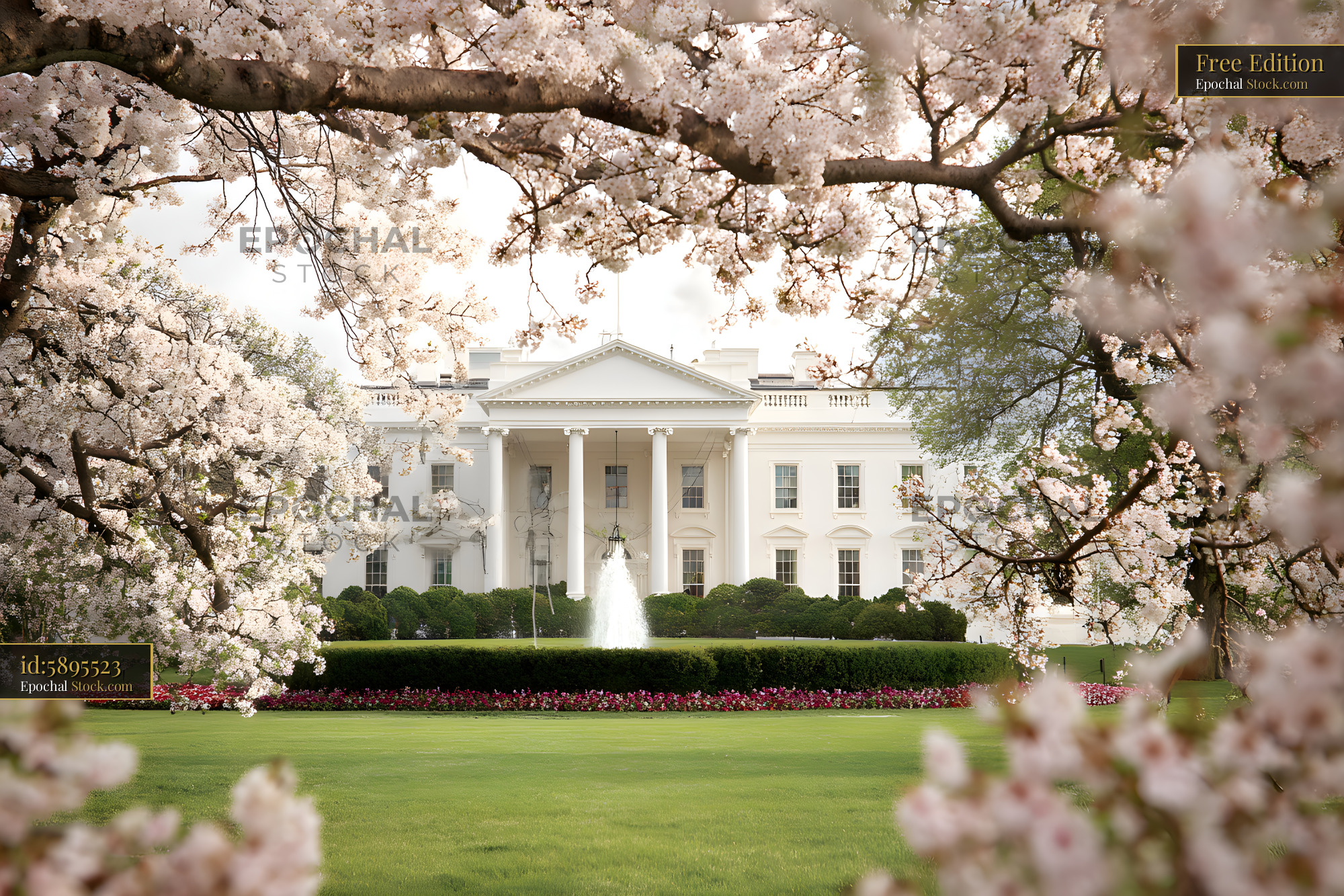 Cherry blossom trees frame the White House. The fountain is running, and colorful flowers are blooming in the garden. This scene captures spring at a historical landmark.