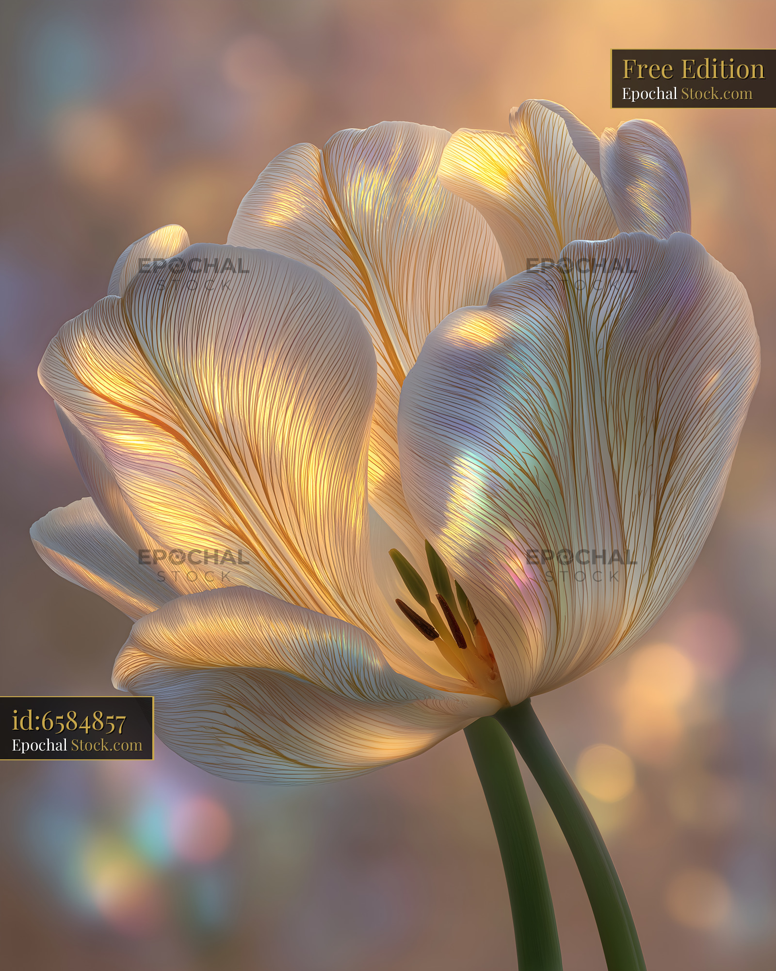 A white tulip flower stands tall with petals that glow softly in the morning light. The background shows blurred colors that enhance the beauty of the flower.