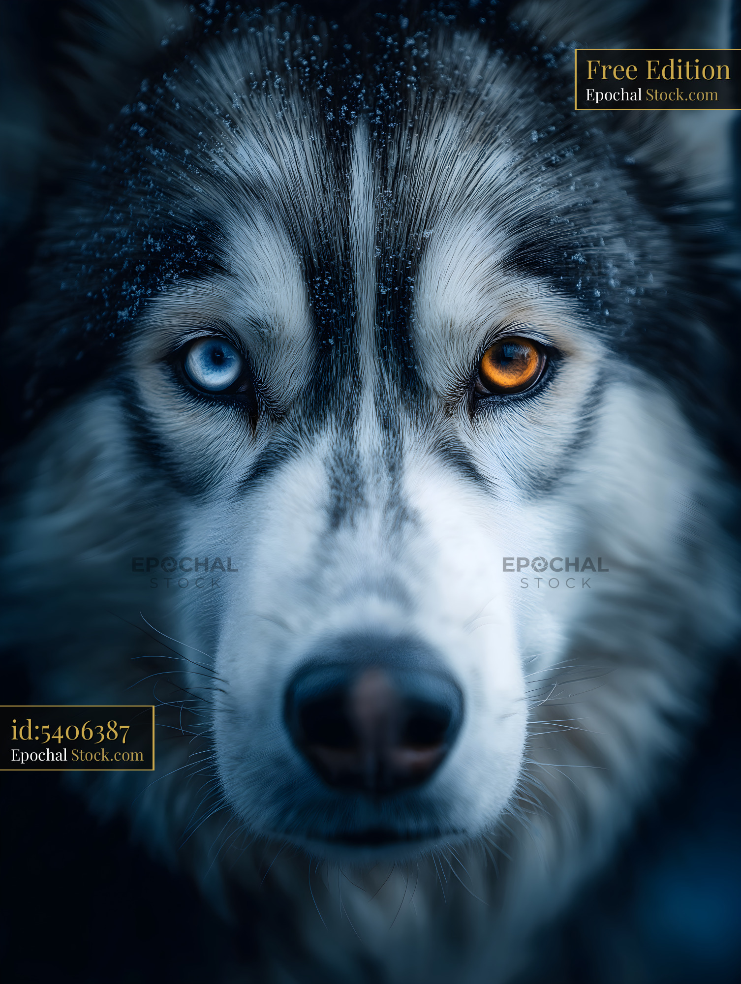 Wolf with blue and orange eyes looks directly at viewer Free Premium Stock Photo
