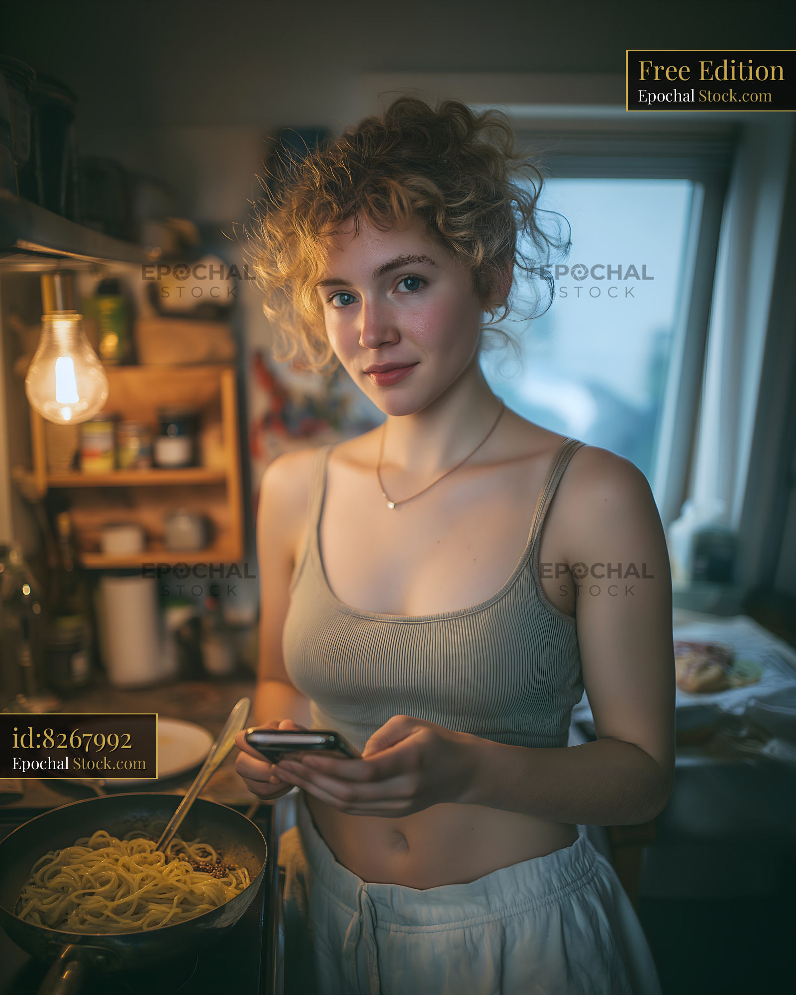 A woman stands in a kitchen cooking pasta. She holds a phone in her hand and looks at it. The kitchen has shelves with various items and natural light from a window.