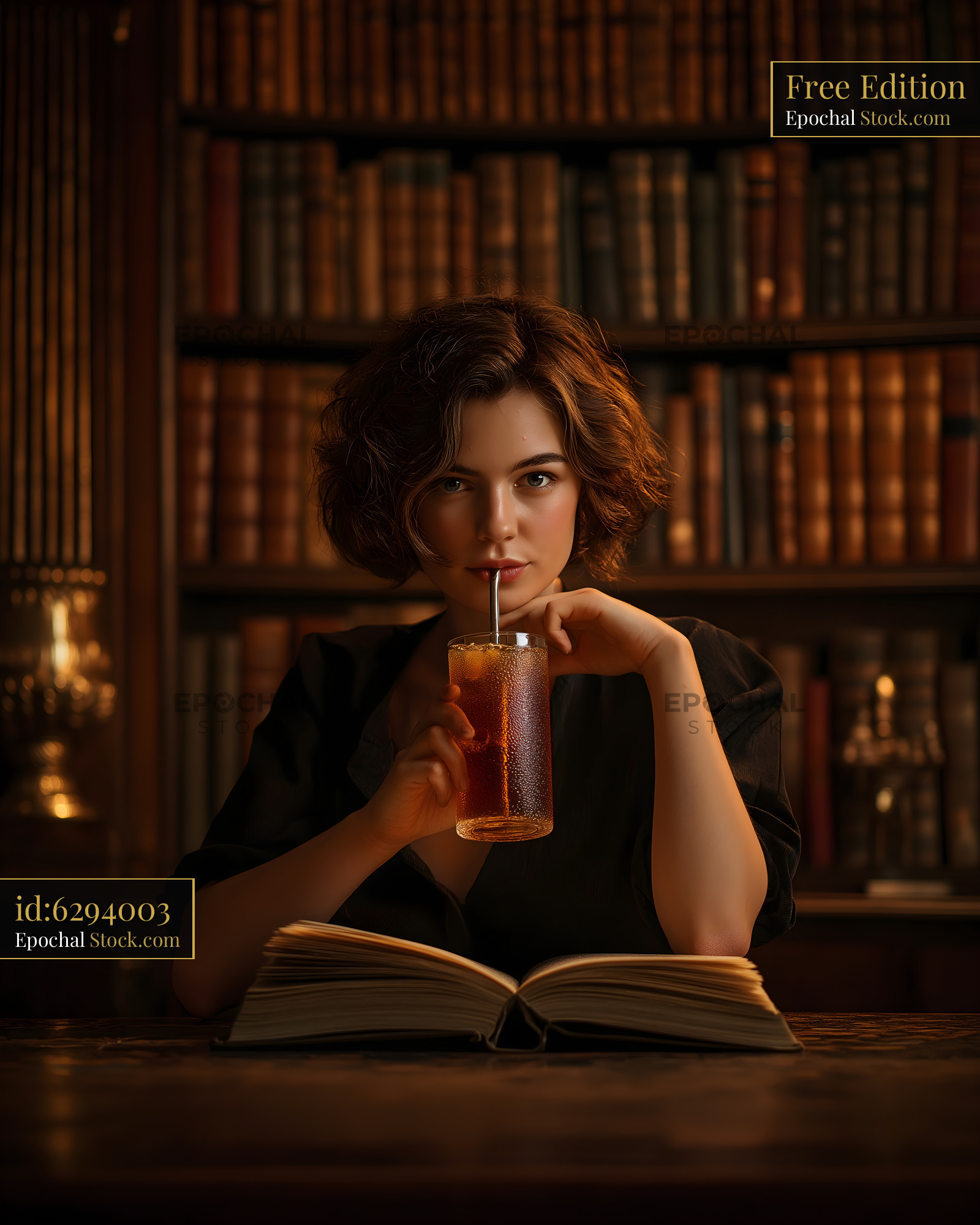 Woman drinks from glass while reading in library Free Premium Stock Image