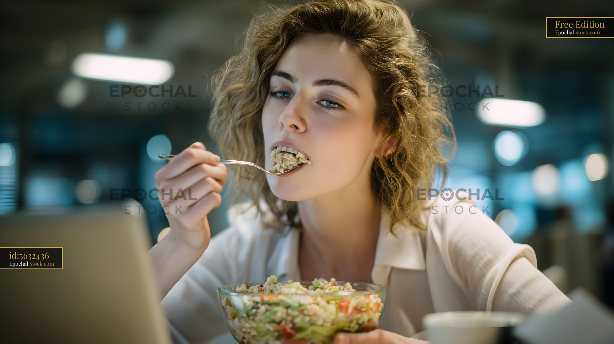 Woman eats salad while sitting at desk in office Free Premium Stock Photo