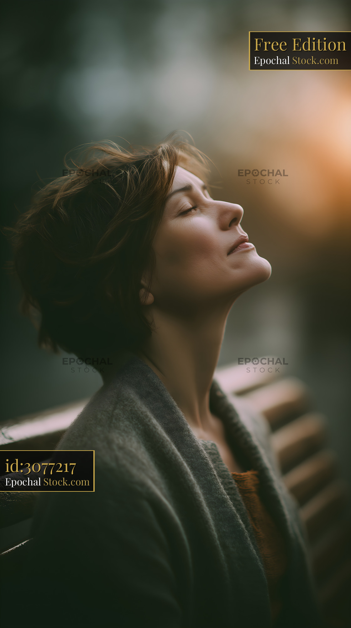 A woman sits on a bench, eyes closed, facing the setting sun. Her hair moves gently in a soft breeze. The background is blurry, highlighting her peaceful expression in a natural setting.