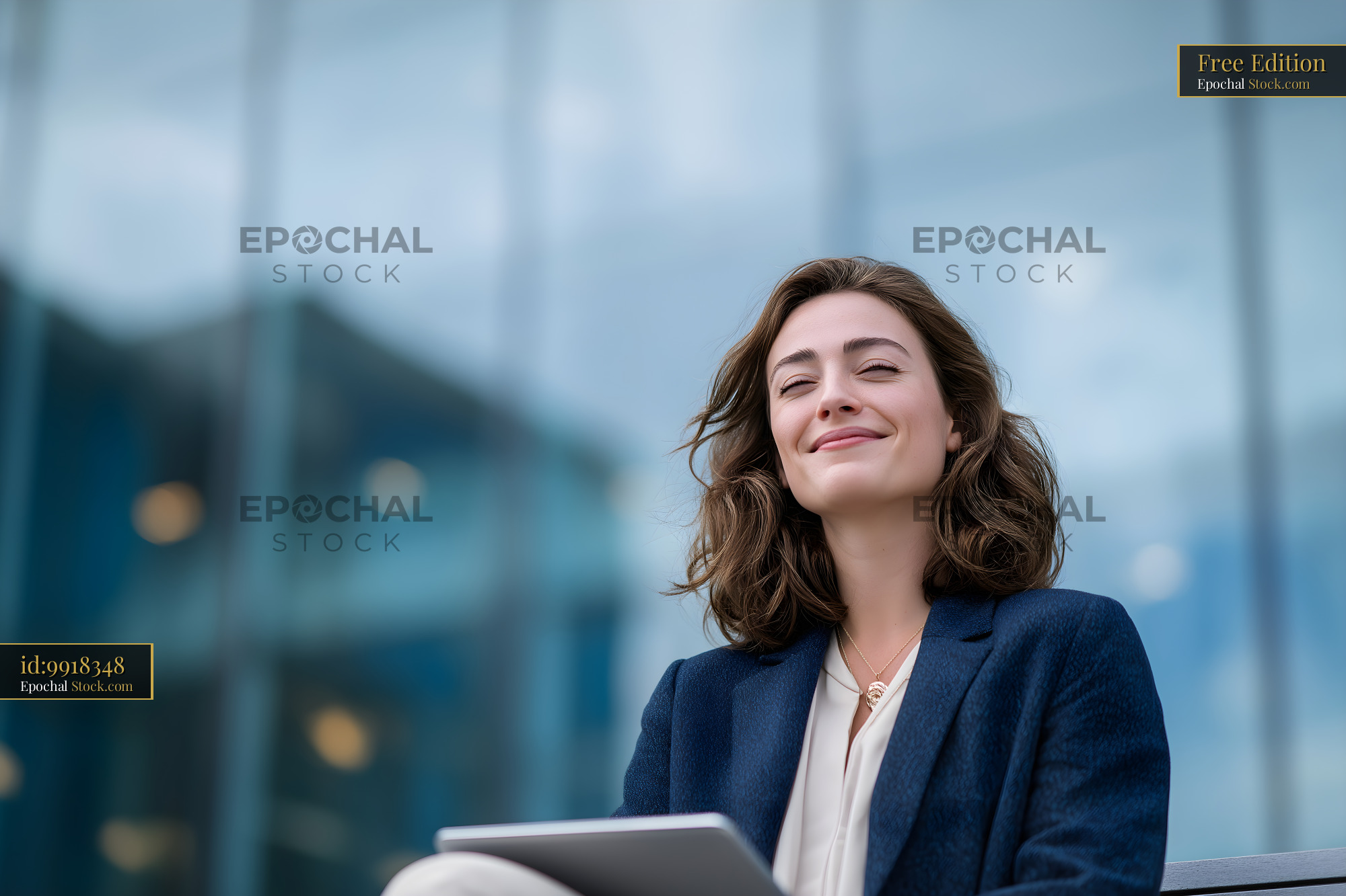 A woman sits outside a modern building using a tablet. She looks relaxed and happy as she works. The glass building reflects the sky and city lights.