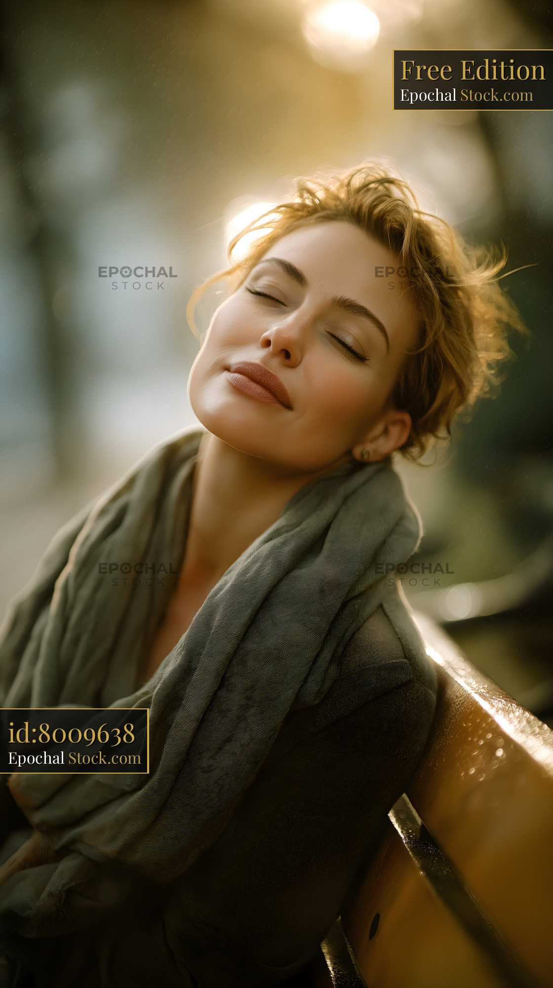 A woman sits on a bench with eyes closed, enjoying a moment outdoors. Soft sunlight shines around her as she relaxes, wrapped in a warm scarf.