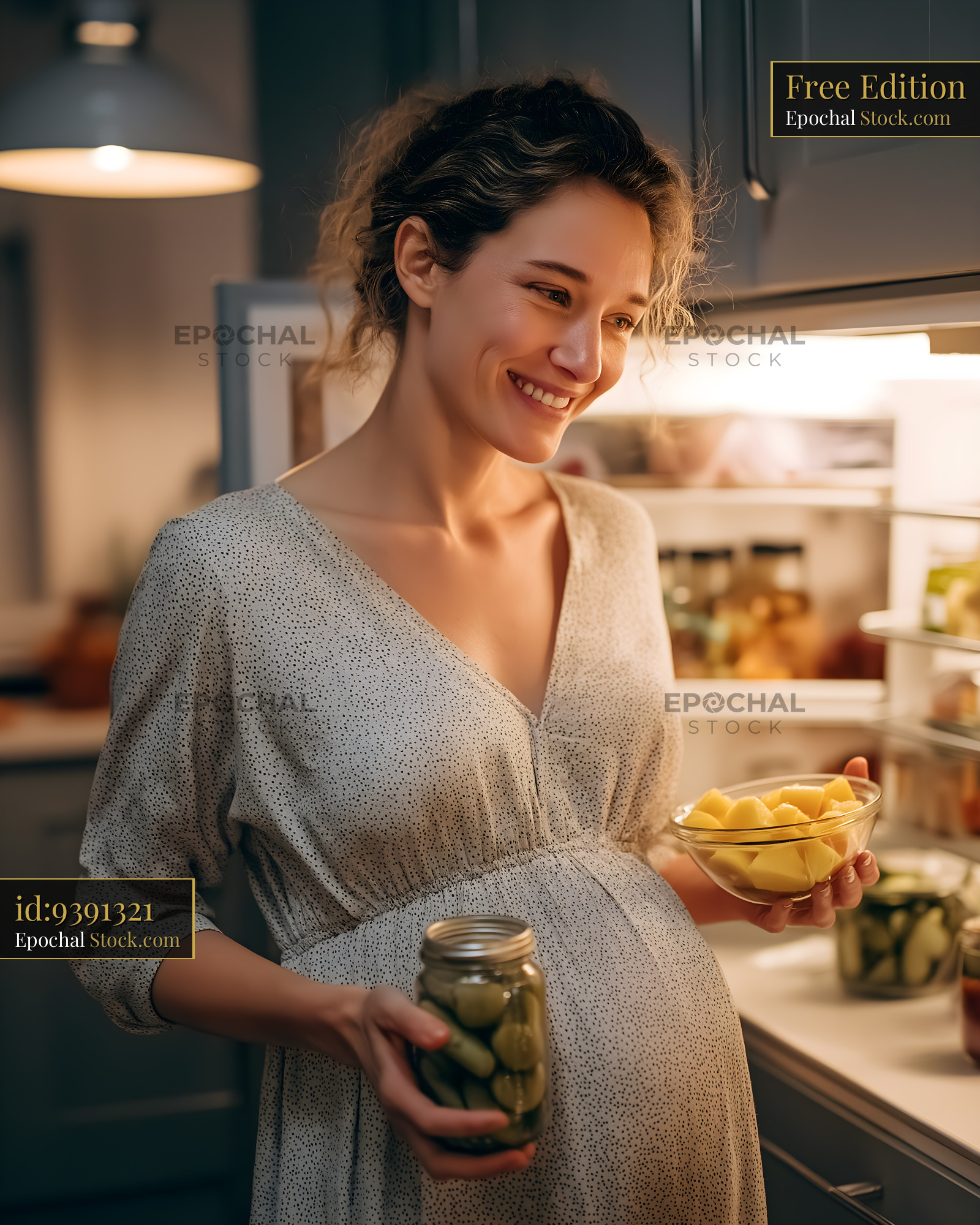 A pregnant woman is in her home kitchen during evening hours. She is smiling while holding a bowl of fruit and a jar of pickles. The refrigerator is open, showing food inside.