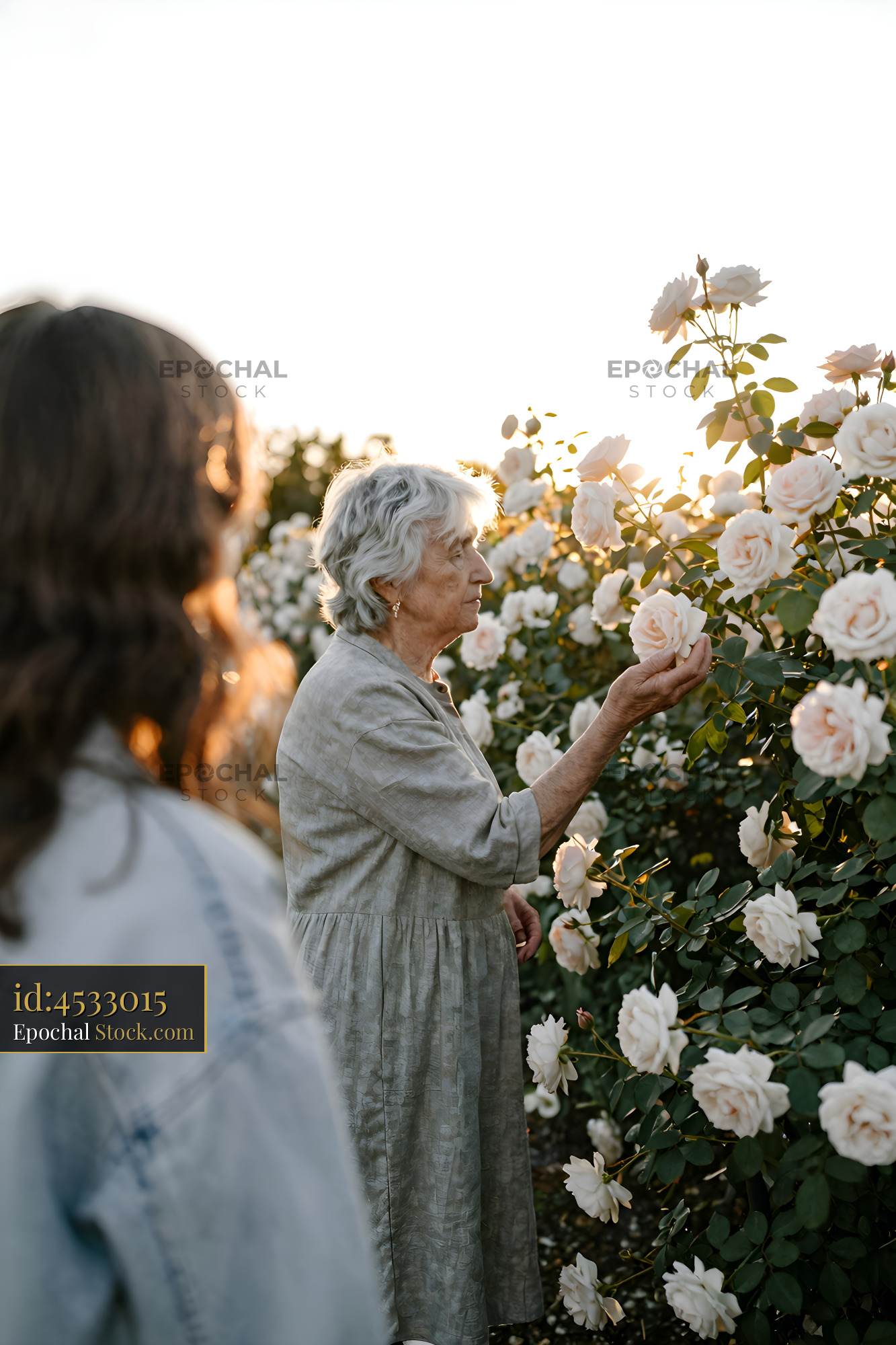 A woman examines a white rose in a garden filled with blooms as the sun sets. Another person stands nearby, watching her enjoy the flowers and the moment.