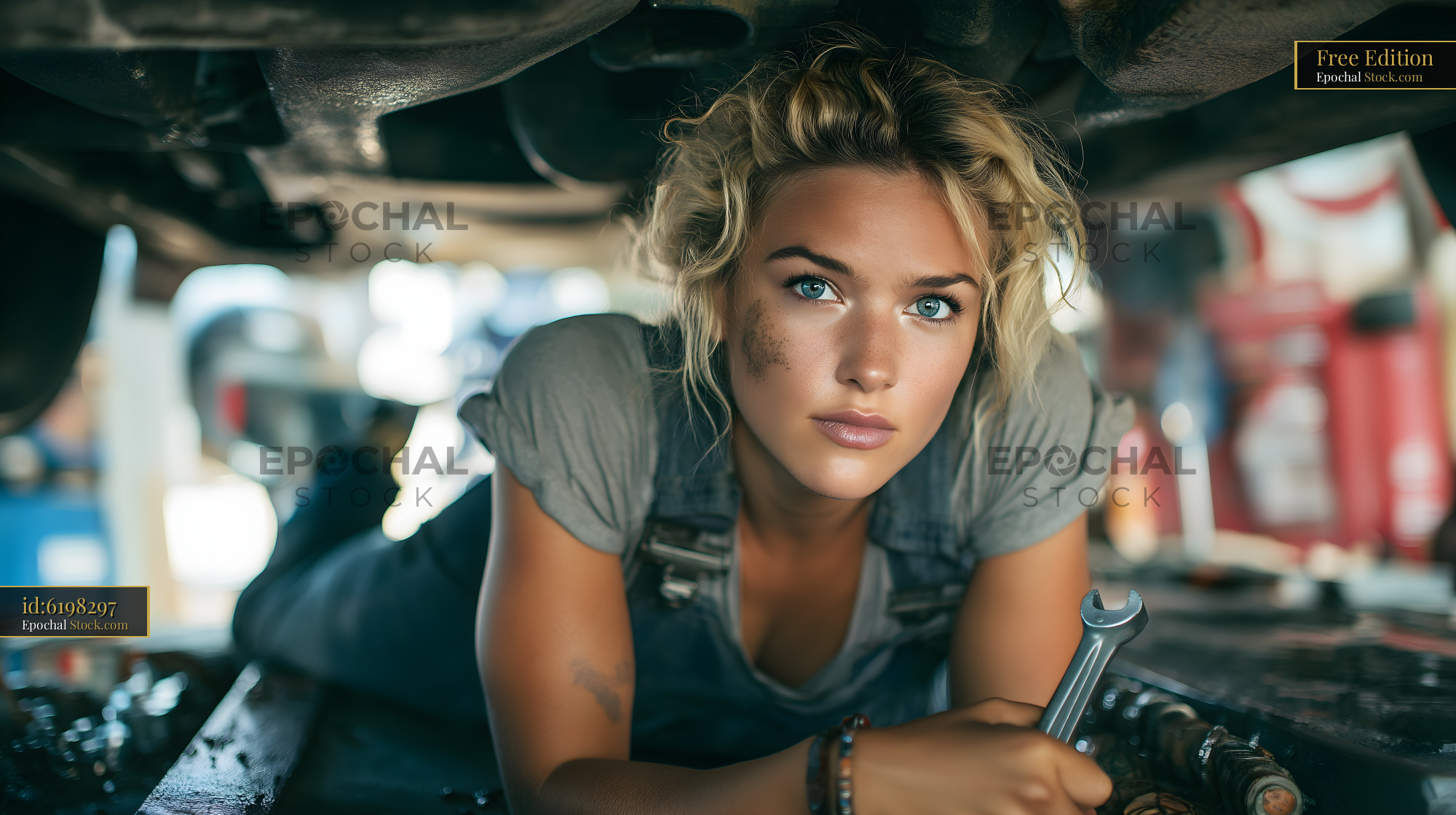 A woman works on a car in a garage. She is lying under the vehicle and using a wrench. The scene shows tools and equipment around her. It is daytime and bright inside the garage.