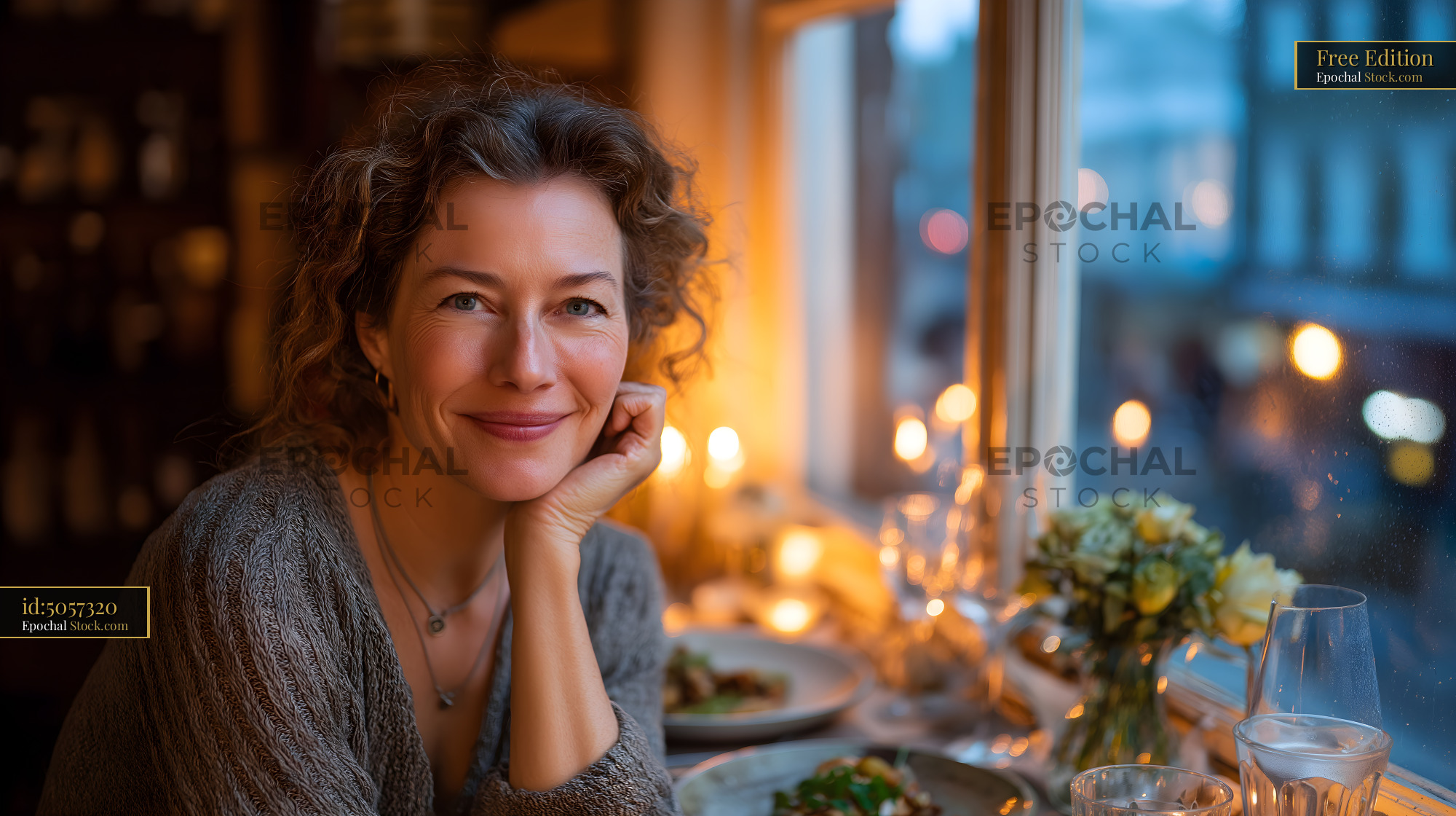 A woman sits at a dinner table by a window in the evening. She smiles and rests her chin on her hand. Candles and flowers are on the table. Outside, the lights from the street shine softly.