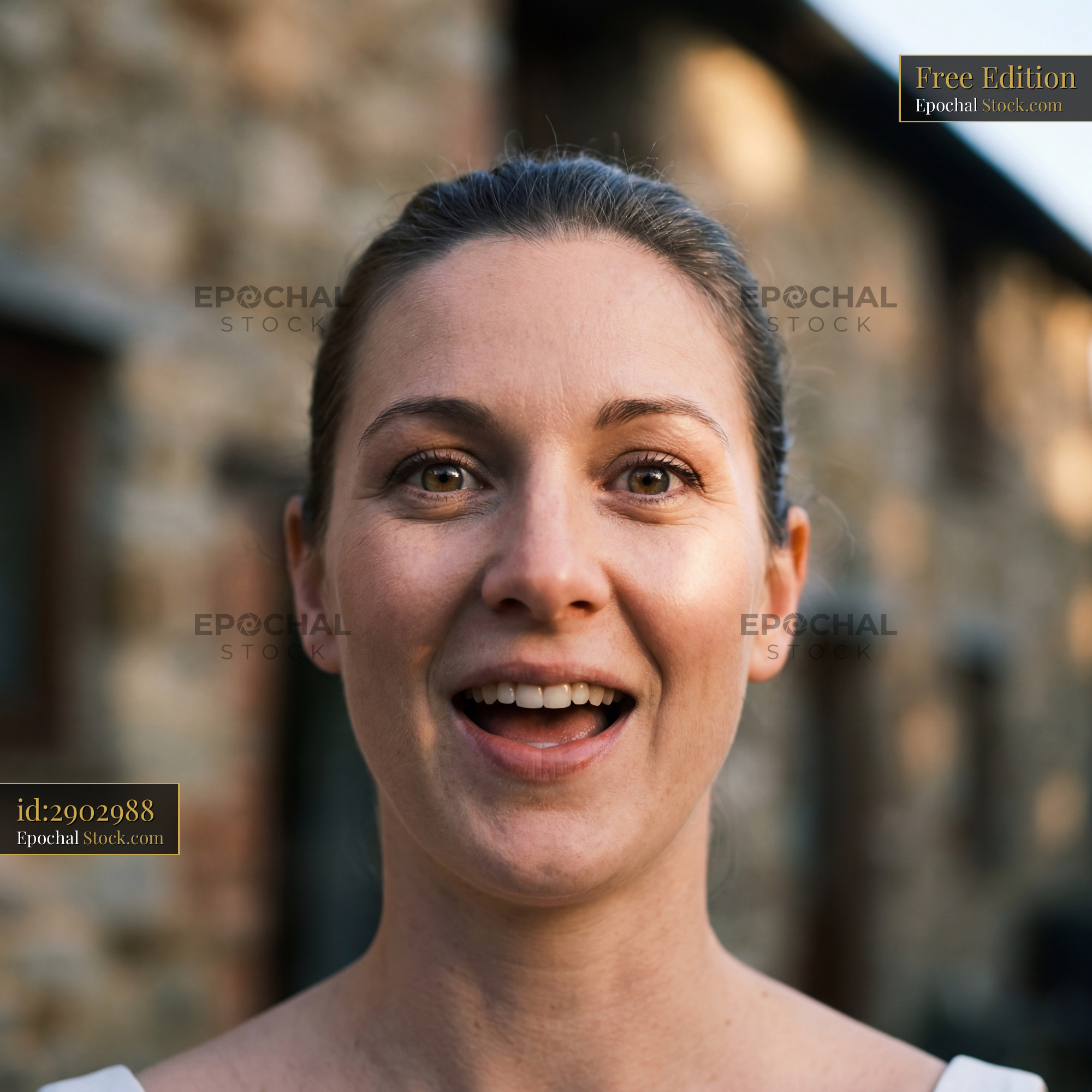 A woman stands close to a stone building. She smiles broadly while looking at the camera. The sun sets behind her, creating a warm glow on her face.