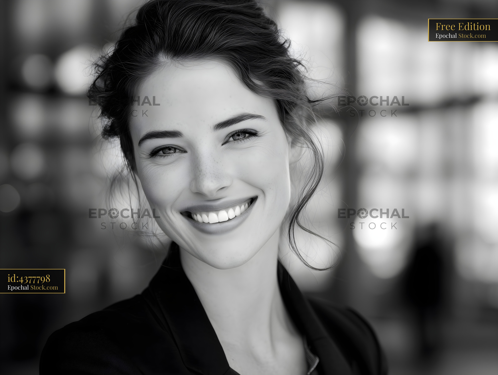 A woman with long hair smiles while standing in a bright and open area. The background shows blurred figures and glass structures. She looks confident and joyful in the moment.