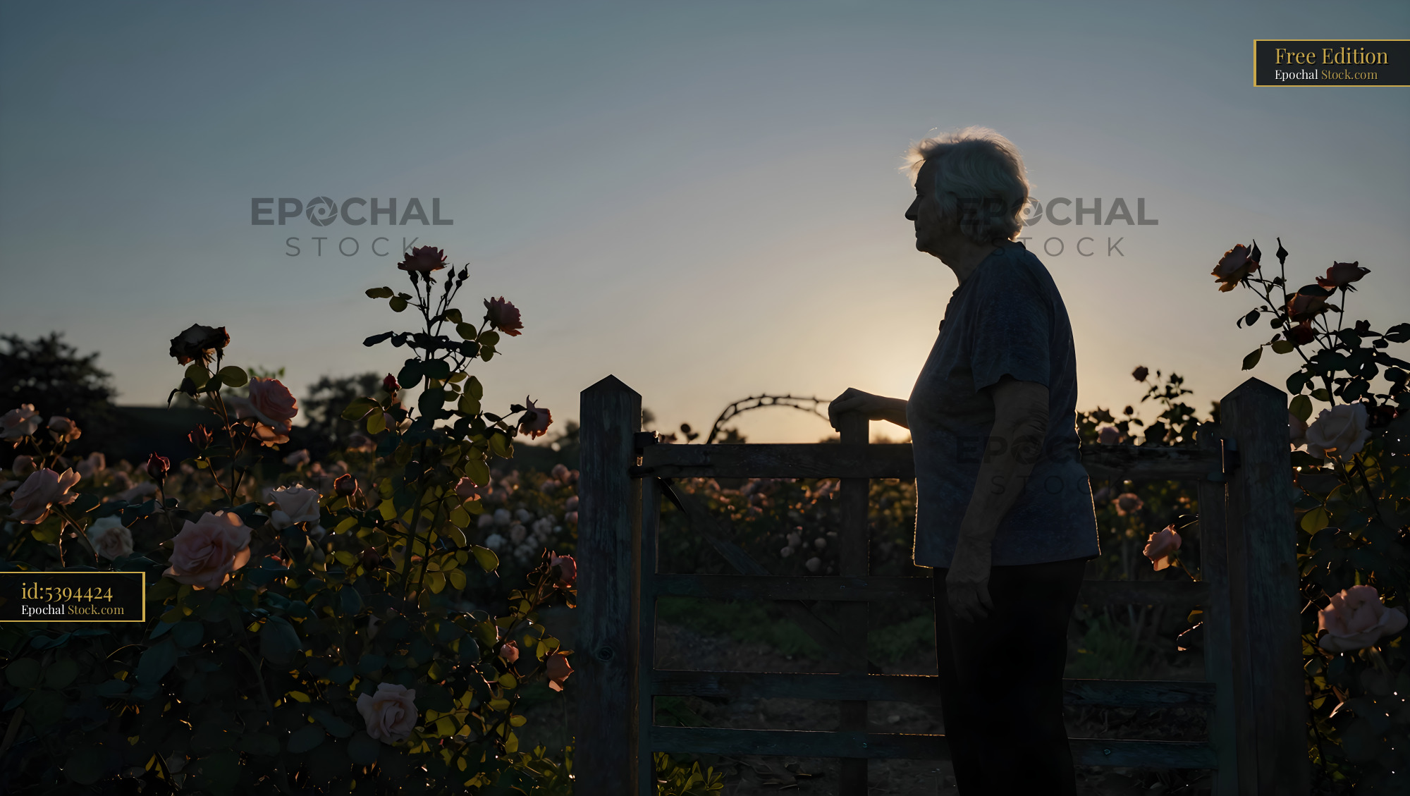 A woman stands by a wooden gate, looking at a rose garden during sunset. The sky has light fading colors and flowers are gently lit by the last sun rays.