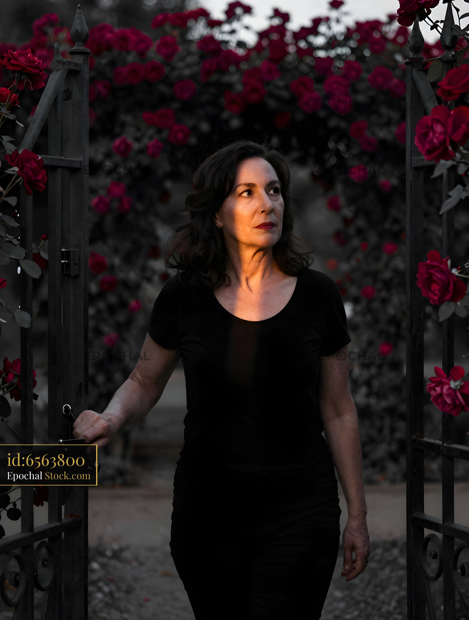 Woman walks through a gate with roses in the background Premium Stock Image