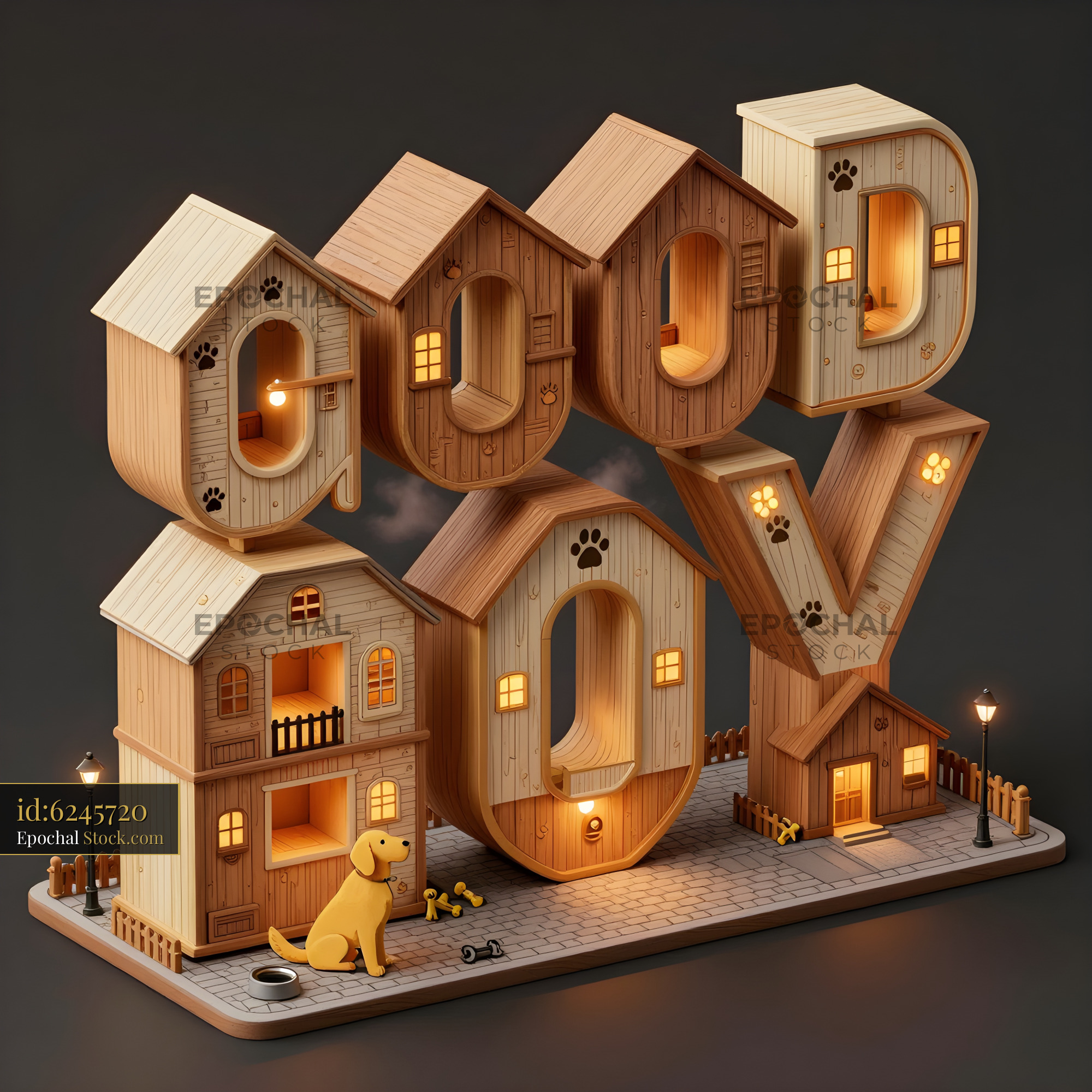 Wooden letters create house shapes on a flat surface. A little dog sits nearby. Lights shine from the letters, adding warmth. The scene shows a blend of creativity and playfulness in design.