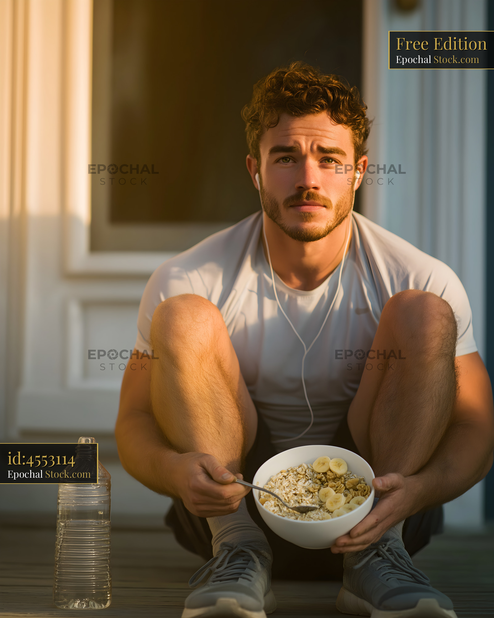 A young man sits on a wooden surface outside. He is eating a bowl of cereal with bananas while listening to music with earbuds. A water bottle is next to him.