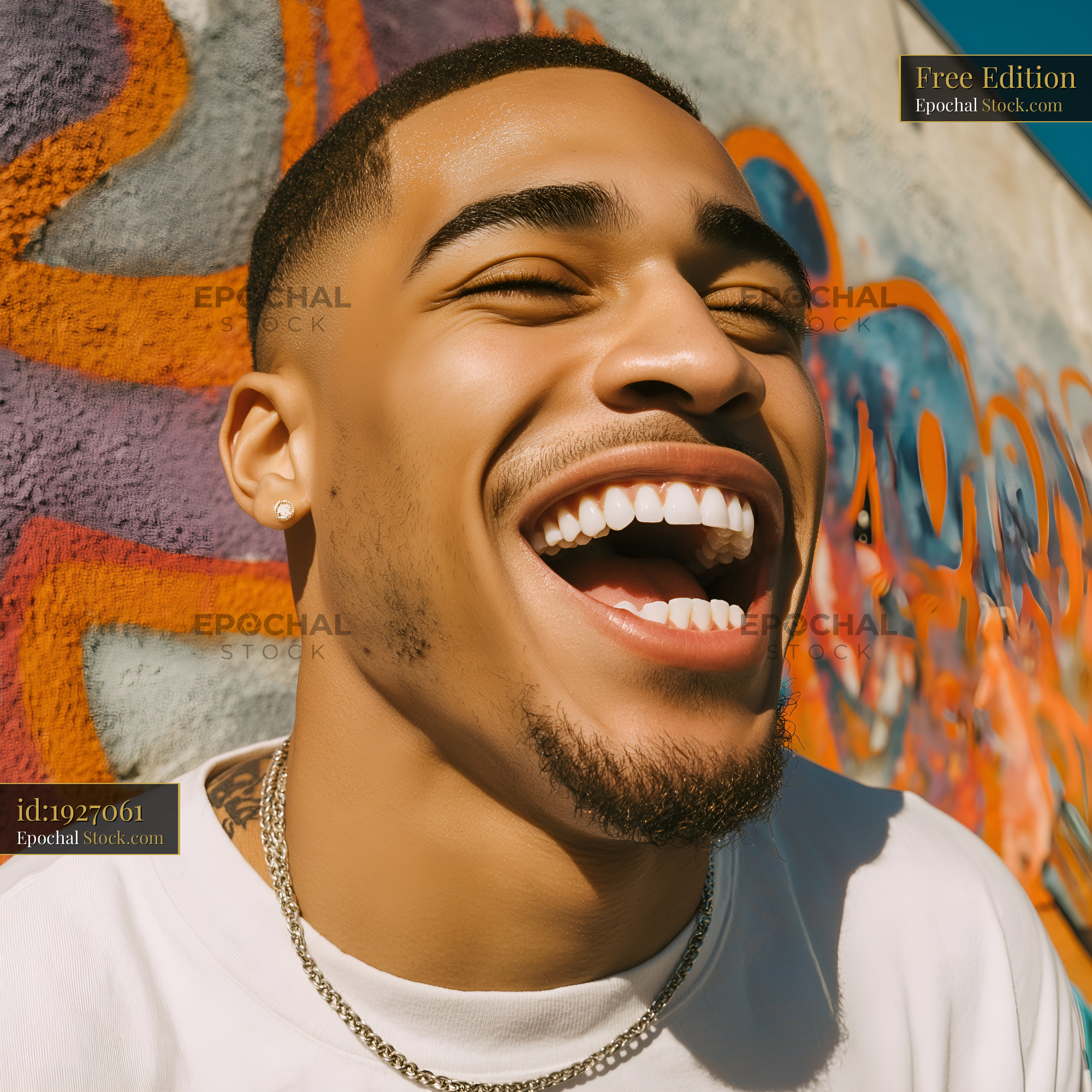 Young man laughs joyfully in front of colorful wall Free Premium Stock Image