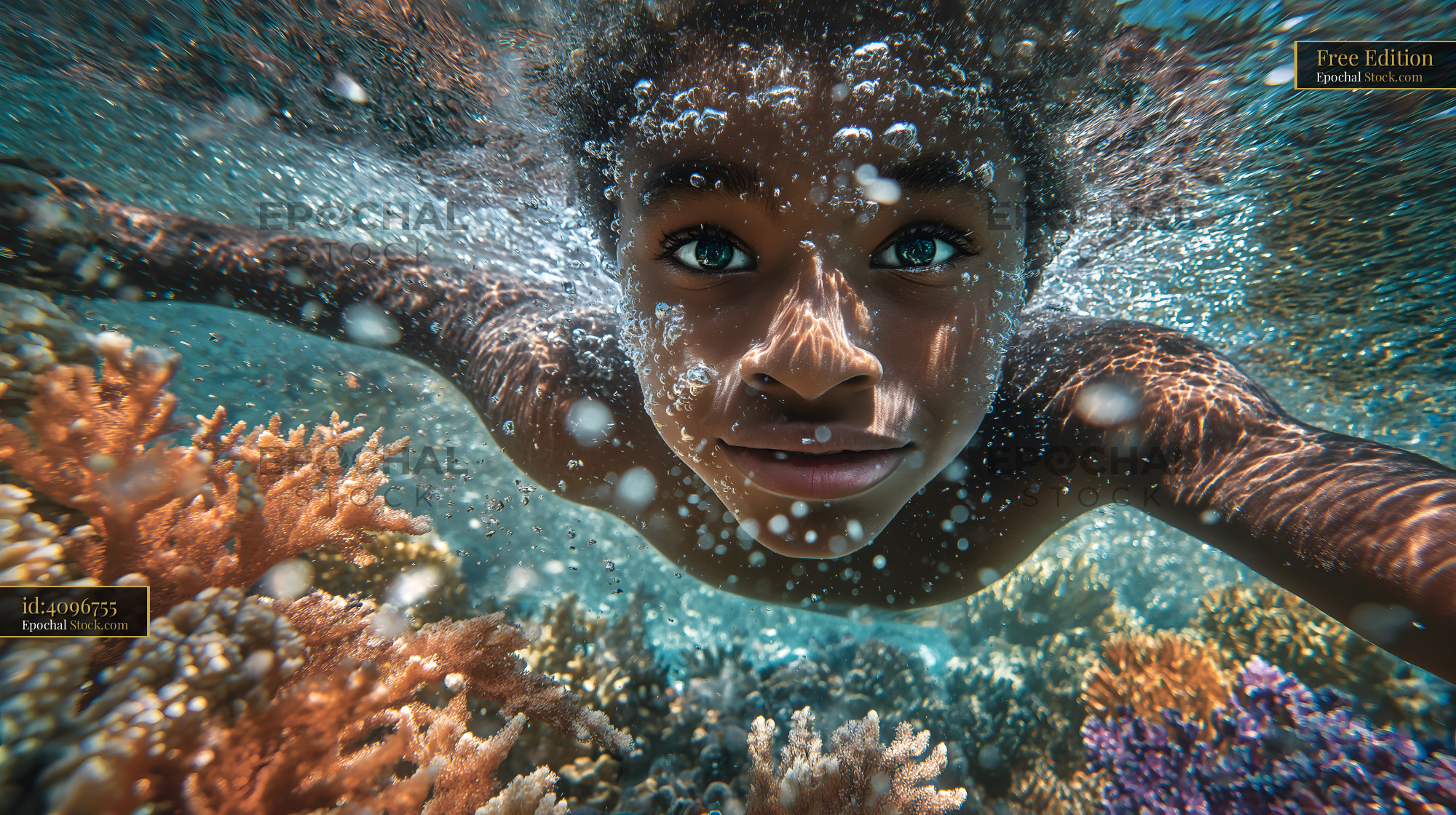 A young person with dark skin swims underwater among a colorful coral reef during the day. Water bubbles surround their face as they look directly forward, exploring the vibrant marine life.