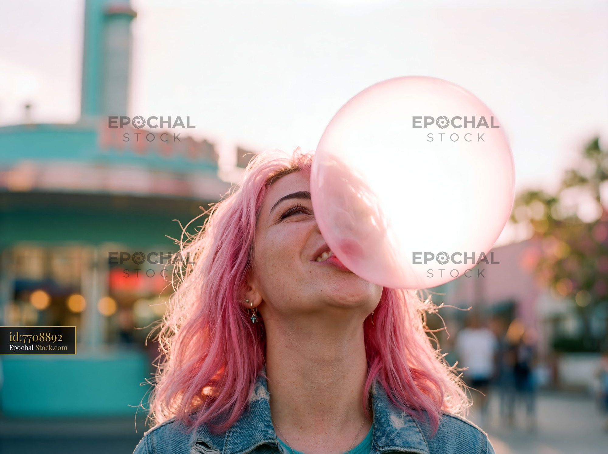 A young woman stands outside with a big bubble of pink gum. She is smiling and enjoying her time. People walk by in the background as the sun sets.
