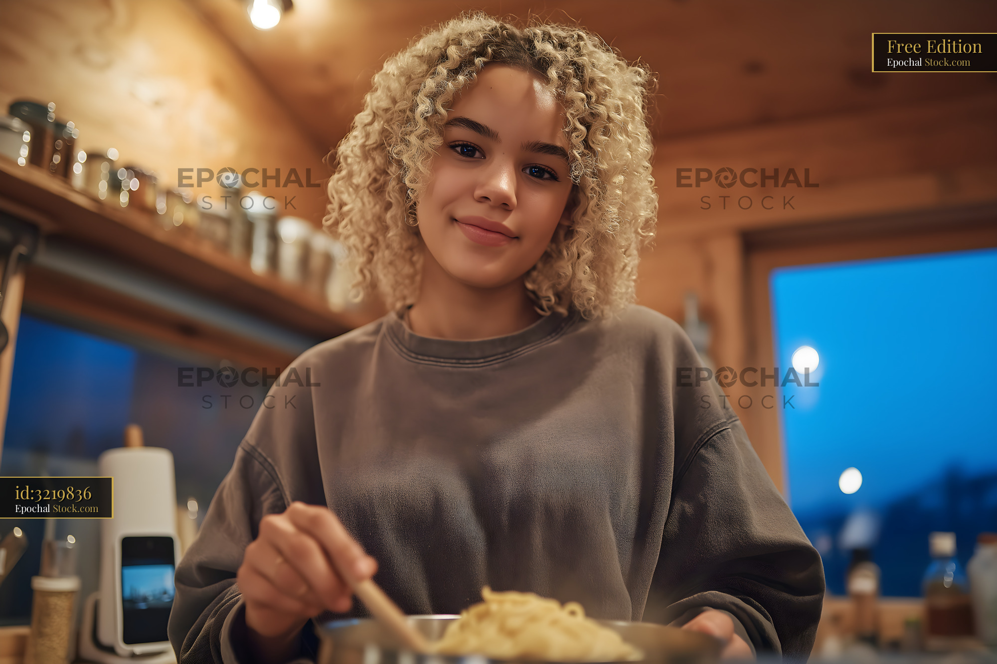 A young woman stirs pasta in a pot in a kitchen during the evening. She has curly hair and wears a simple sweater. The kitchen has wooden walls and soft lighting.