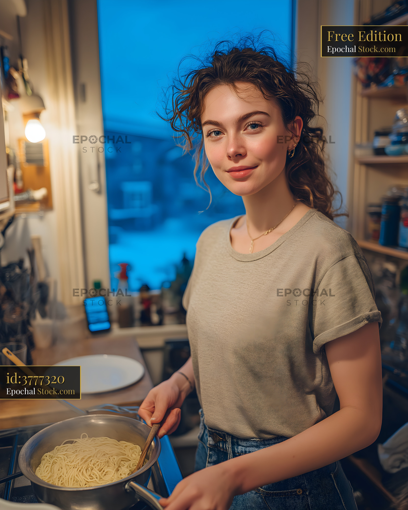 Young woman cooks pasta in a cozy kitchen at sunset Free Premium Stock Image