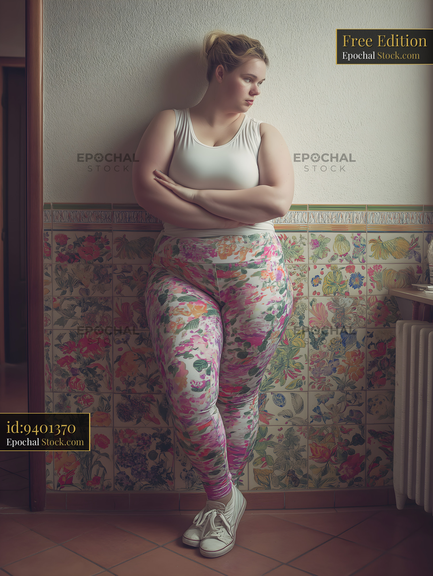 A young woman leans against a wall in a room. She wears a white top and colorful floral leggings. The wall has tiled decoration with a floral pattern.